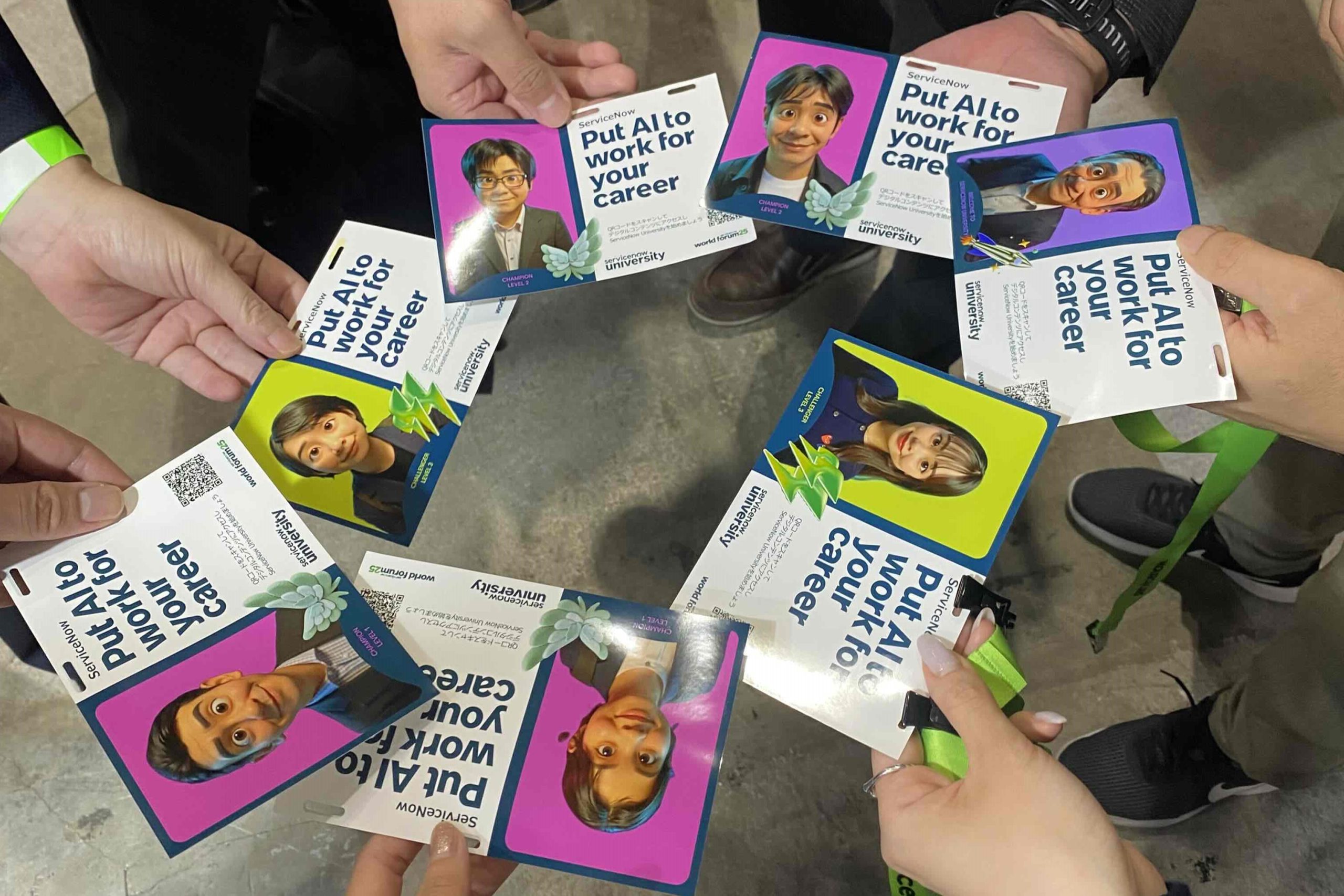 最後のセクションでは、これまでの学習成果やServiceNowコミュニティでの貢献度に応じたランクを確認することができます。初めに受け取ったロケットトークンを機械にかざすことで、AIアバターとランクが画面上に表示されます。最後にAIアバターの画像がプリントされ、ネックストラップと共に受け取ります。ランクに応じたピンバッジも配布され、来場の記念に持ち帰ることができました。